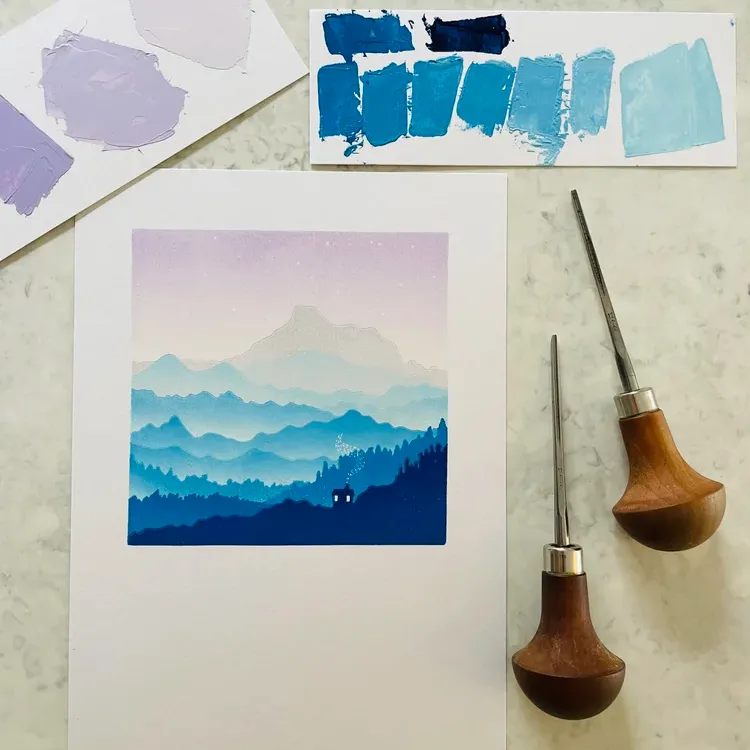 The entire process of linocut is profoundly tactile and wonderfully meditative. From the subtle resistance of the blade carving into a fresh block of lino to that moment of lifting the paper and revealing the final print, it never loses its sense of magic.