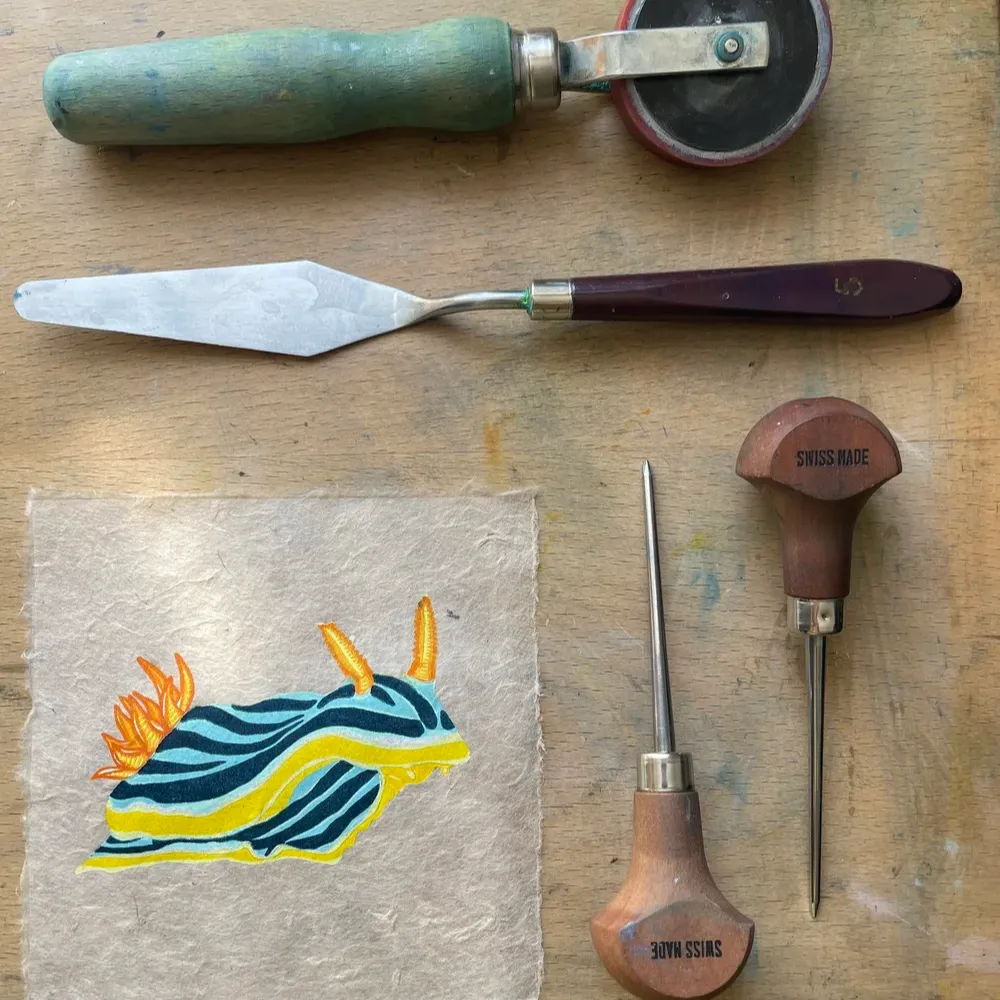 This module is for anyone ready to take their lino prints further and explore generating a small creative income. You’ll learn practical strategies for printmaking on a budget, including affordable tools, DIY solutions, and sourcing materials sustainably and economically.